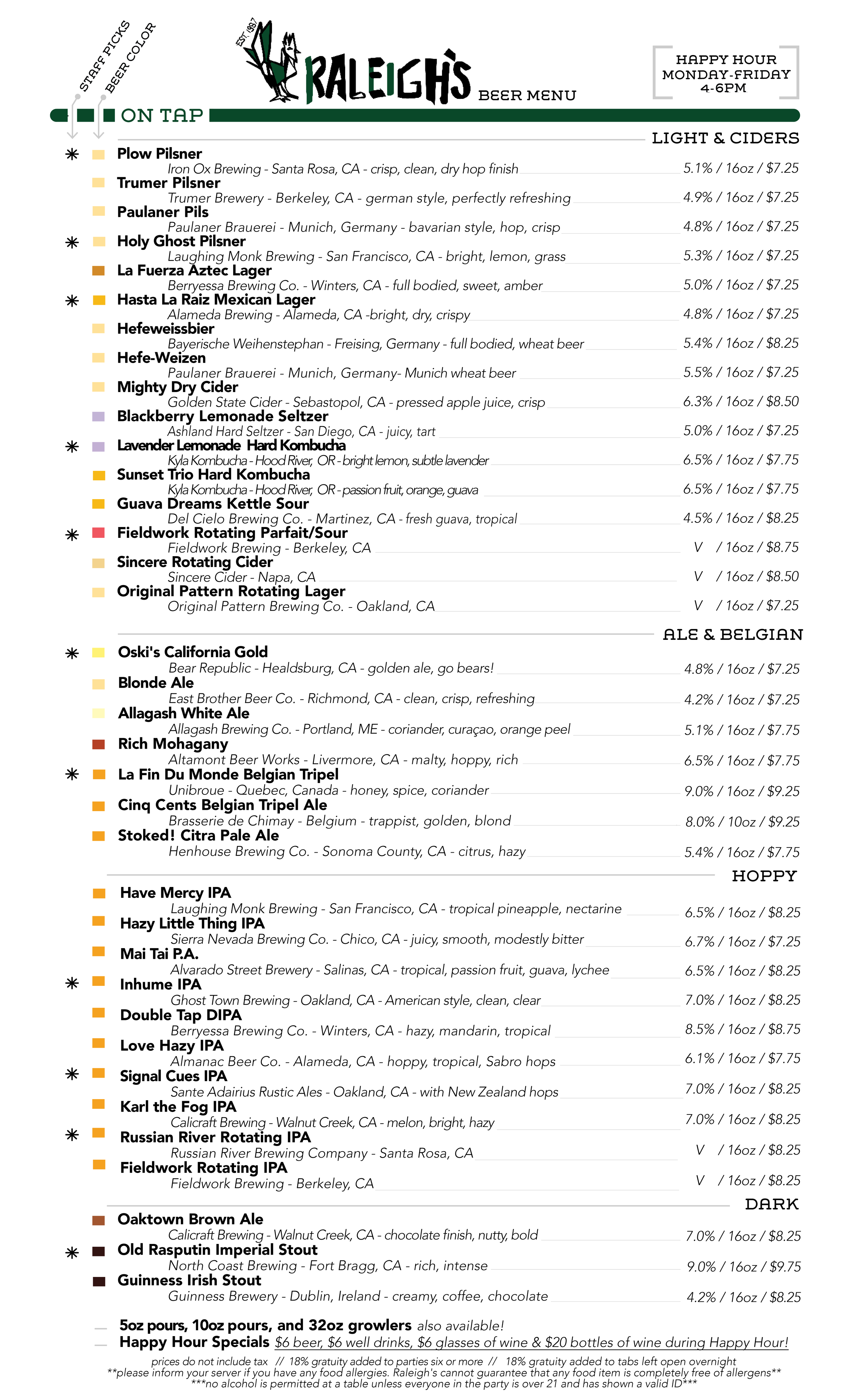 With 36 craft beers on tap in the main bar, and another 24 taps on our sunny patio bar, we certainly have something for everyone! Our lunch & dinner menu offers traditional pub & grill food----designed to pair perfectly with any pint. If beer is not your thing, no worries! We offer a full bar, too! Raleigh's is your home to watch sports (Roll on you bears!) or just hang back and enjoy a cold one. Cheers!